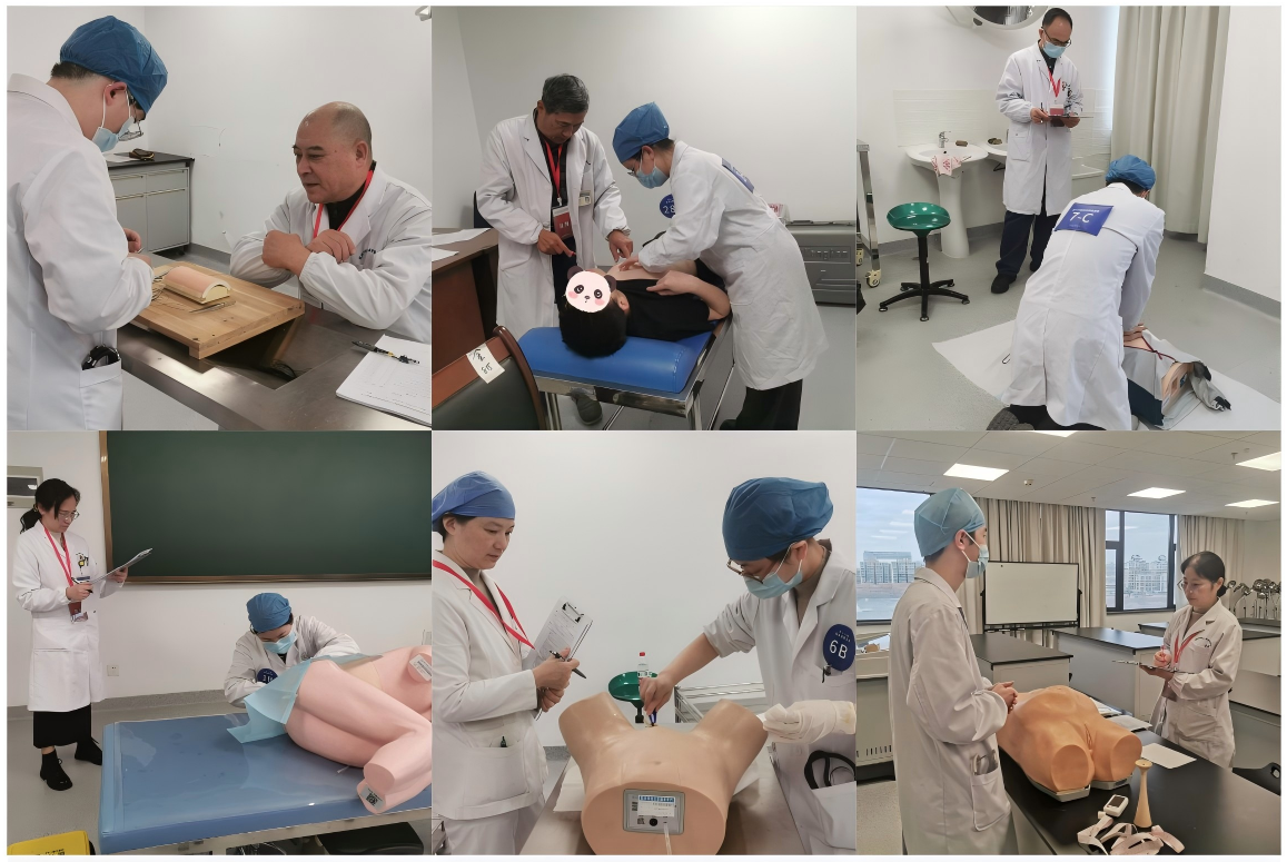 本届竞赛面向2021级临床医学专业全体学生,得到了各实践教学基地的高度重视与积极响应,来自13家实践基地共30支队伍参赛。竞赛采用多站式客观结构化临床考核(OSCE)模式,紧密对接临床实际需求,科学设置了临床思维能力测验、单人徒手心肺复苏、体格检查、腰椎穿刺、外科缝合、产科检查、导尿术、心电图判读及影像读片共计九个考核站点。其中技能操作站点每站限时7分钟,全面考察了参赛学生在知识应用、技能操作、临床思维、人文沟通及临场应变等方面的综合能力。比赛过程组织严密,流程规范,所有参赛队员考核内容一致,并依据统一标准进行评分,最终汇总产生个人与团队成绩。